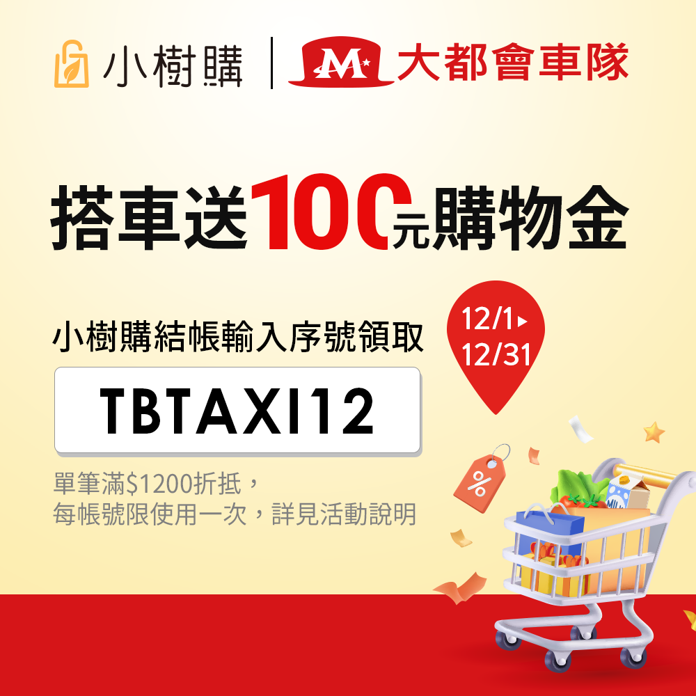 活動期間於小樹購消費單筆金額滿NT$1,200,結帳時於購物車折價券欄位輸入序號TBTAXI12並點選「領取」方可享現折100元優惠